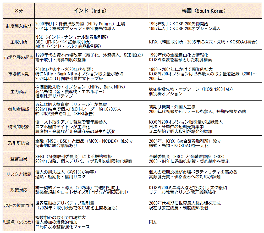 インドのデリバティブ発展プロセスは、1990年代の韓国を知る人間にとってはどこか既視感がある。当時の韓国は経済自由化とIT化を背景にKOSPI200先物・オプションを導入し、世界有数のデリバティブ大国へと変貌した。インドが2000年に株価指数先物を上場させた歩みは、ある意味で韓国の延長線上にある。NSEとBSEによる電子取引の普及、透明性の高い清算制度、投資家教育の推進が、市場拡大の原動力となった。つまり勢いの裏に「個人主導の短期投機ブーム」が勃興した点である。2025年時点で、インドでは推定1,000万人超の個人投資家がデリバティブ取引に参加しているが、2000年代初頭の韓国でも、KOSPI200オプションが「個人のカジノ市場」と呼ばれ、過熱抑制のための規制強化が行われた経緯がある。また、両国とも政府・監督当局が市場の透明化を推進している点も共通する。前述のようにインドでは統一契約ノート制度を導入し、全取引所で共通書式の報告を義務化した。これは韓国が2005年に取引所を統合して韓国取引所(KRX)を発足させたように、制度整備による信頼確保を図る姿勢と同様である(表参照)。